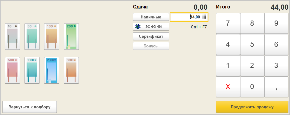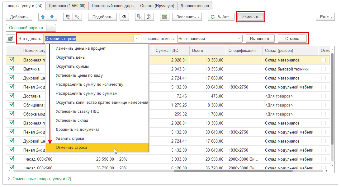 Для отмены товара в таблице "Товары, услуги", прокрутите таблицу вправо и установите флажок в колонке “Отменен” напротив соответствующего товара. Затем введите количество и причину отмены товара.