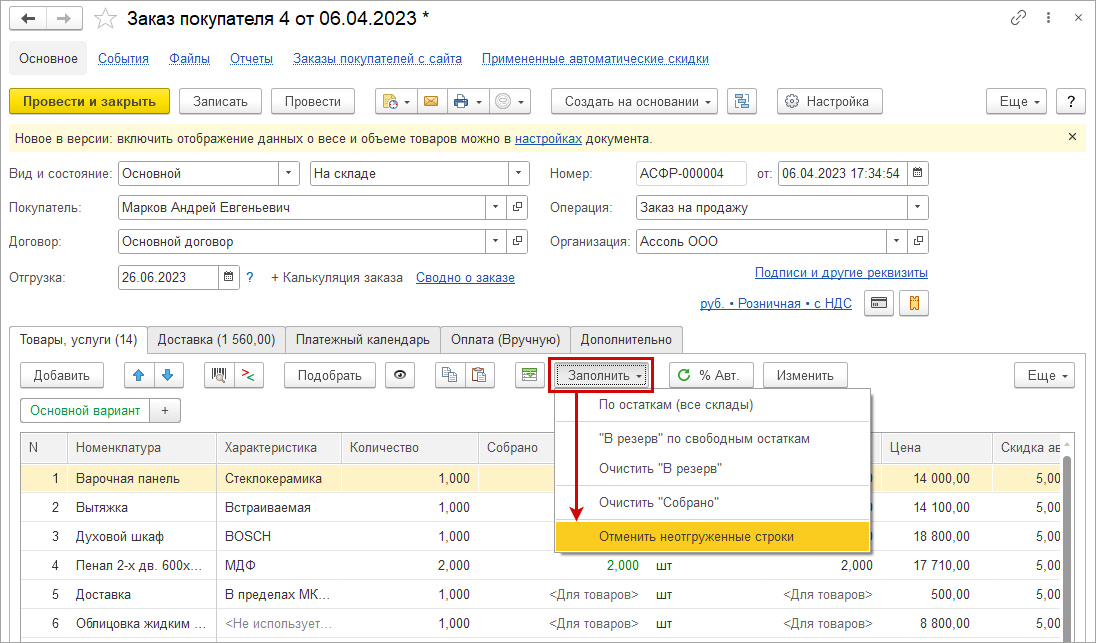 В заказе можно одним кликом отменить все неотгруженные товары. Для этого необходимо перейти в подменю “Заполнить” и выбрать команду “Отменить неотгруженные строки”.