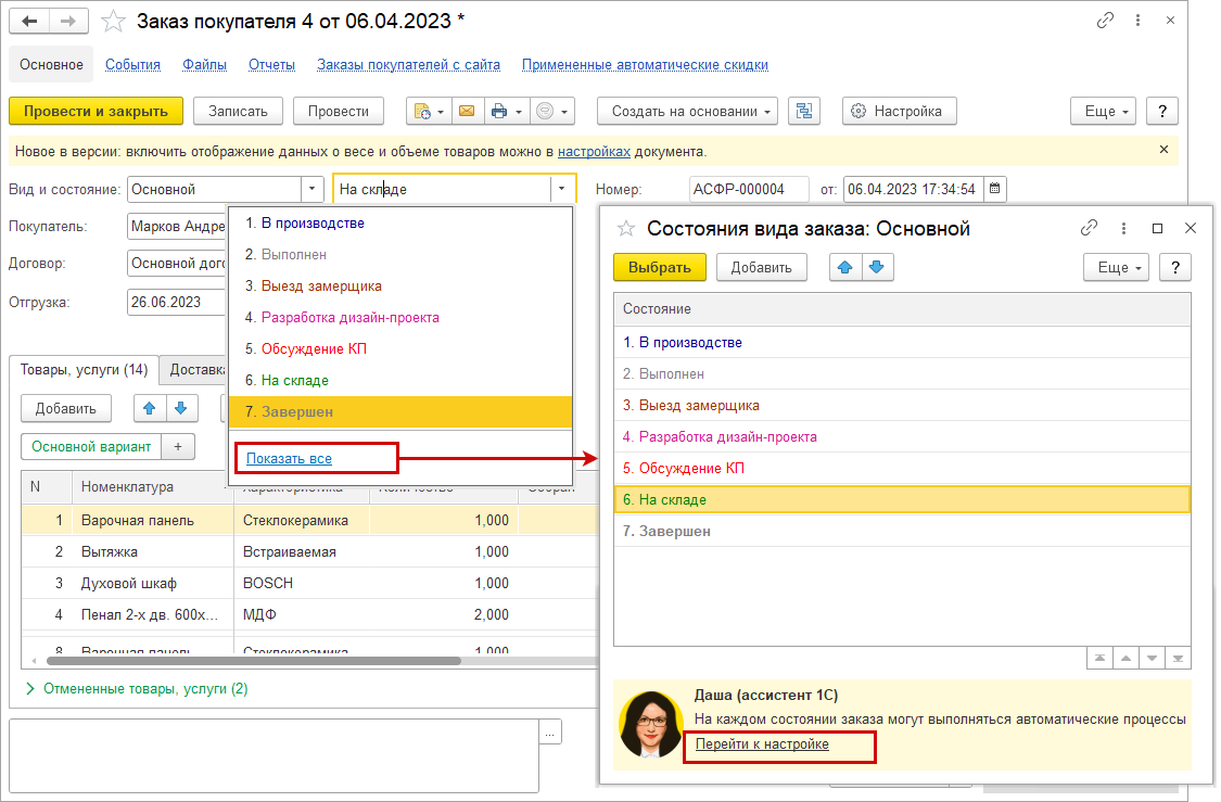 В новой версии можно настроить процессы корректировки заказа, а также навыки Даши, которые выполняются на определенных состояниях заказа.