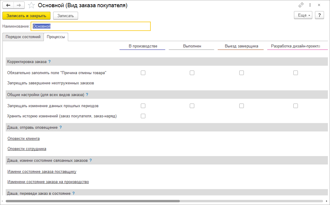 Процессы работы с заказами настраиваются в карточке вида заказа в разделе: Настройки – Все справочники – Продажи – Виды заказов покупателей.