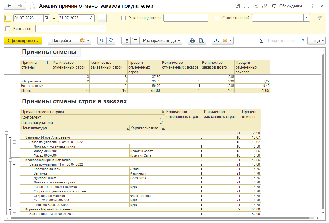 Для анализа причин отмены строк в заказах добавлены отчеты “Анализ причин отмены заказов покупателей”, “Анализ причин отмены заказов поставщику”.