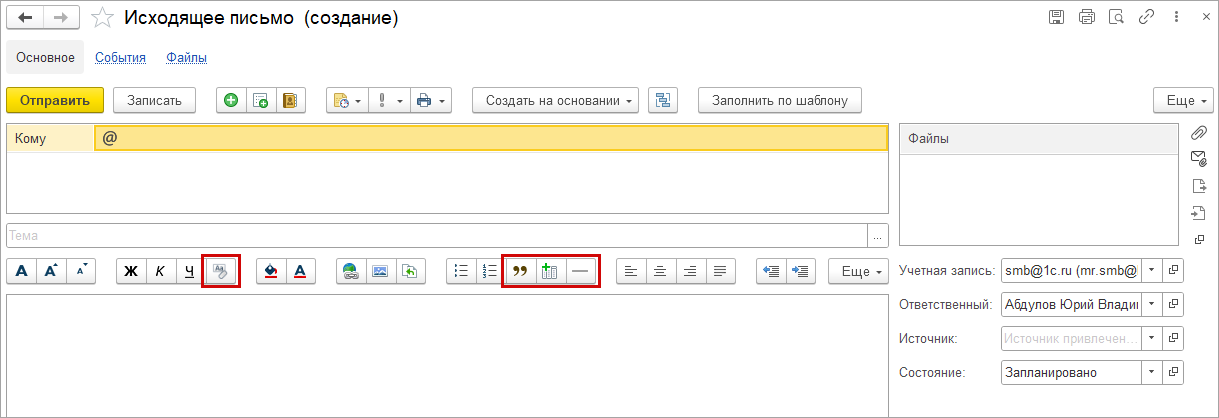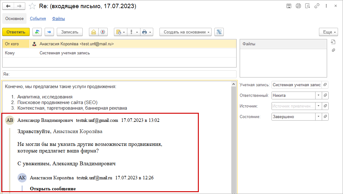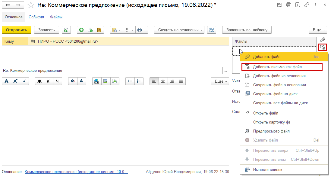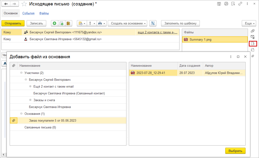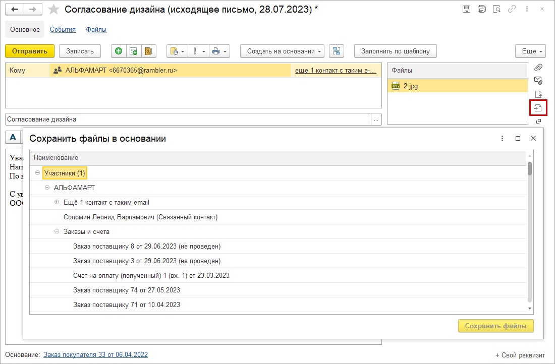 Файлы в письмо можно добавить не только из основания, но и из цепочки писем, контрагента и его контактов, заказов или счетов. Есть возможность добавить сразу несколько файлов, если они связаны с одним объектом.