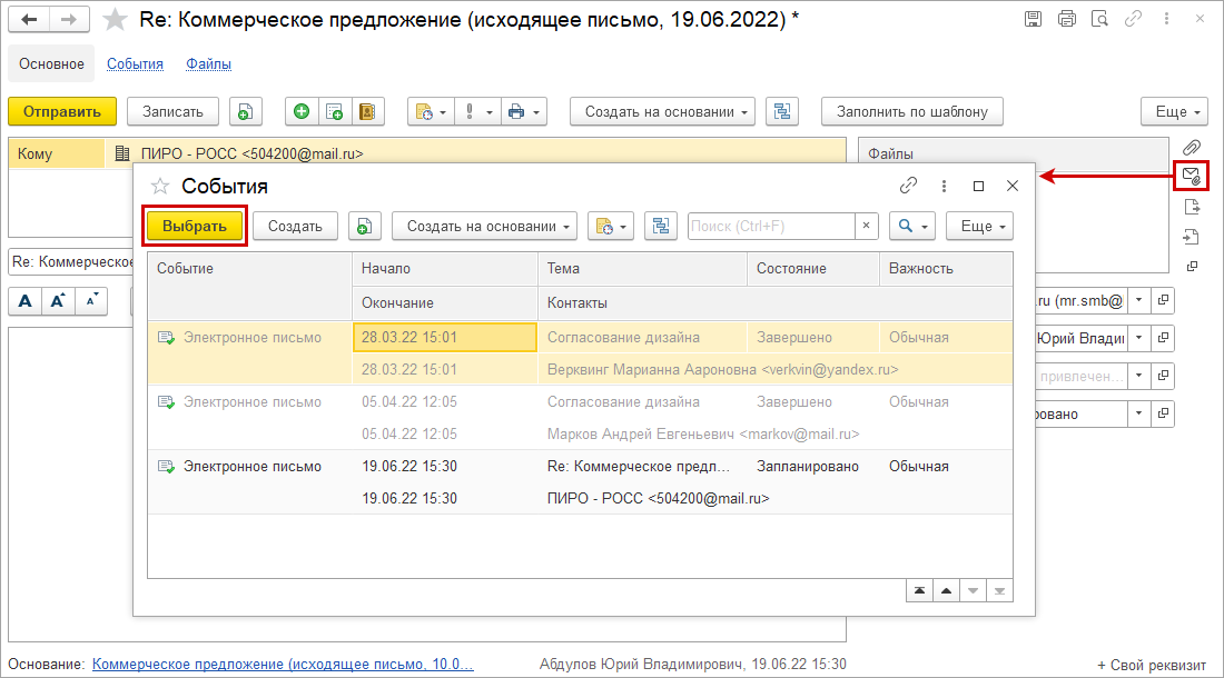 Команды доступны в форме письма, а также списках файлов событий, контрагентов и заказов.