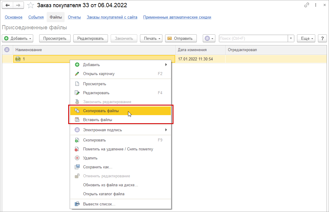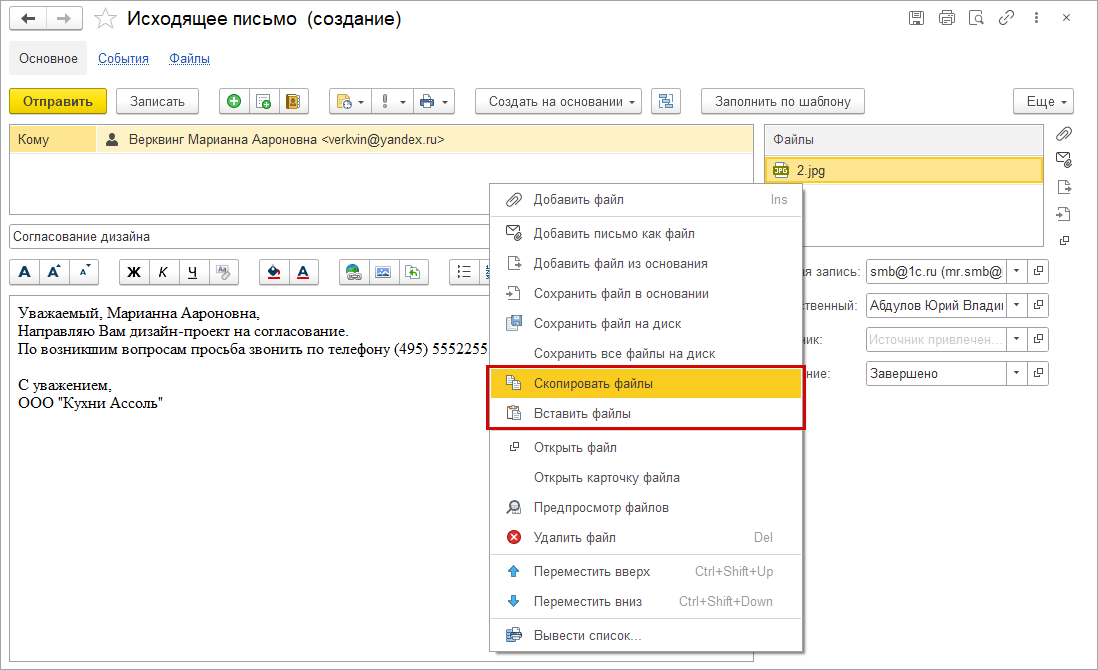 Появилось больше возможностей работы с вложенными файлами. Теперь прикрепленные файлы легко копируются между письмами и объектами с помощью команд "Копировать файлы", "Вставить файлы".