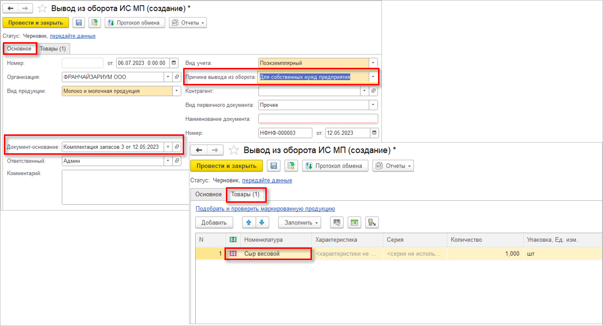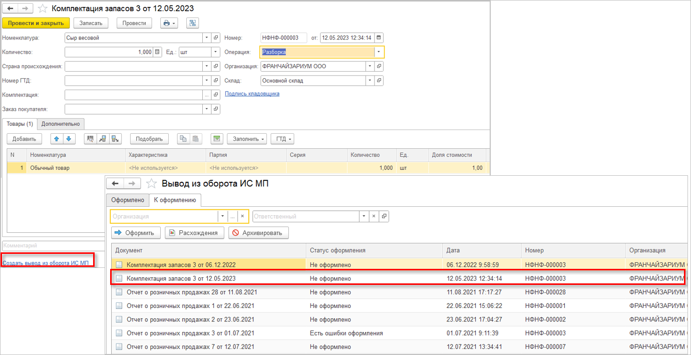 Для удобства передачи информации о выбытии маркируемых товаров в ГИС МТ поддержали формирование документа "Вывод из оборота ИС МП" на основании документа "Комплектация запасов" с учетом используемой операции. При проведении документа "Комплектация запасов", который содержит маркируемую продукцию, теперь автоматически формируется гиперссылка для создания документа вывода товаров из оборота ИС МП и статус с подсказкой "Оформить в панели обмена с ИС МП".