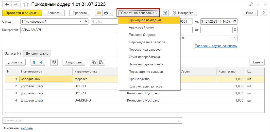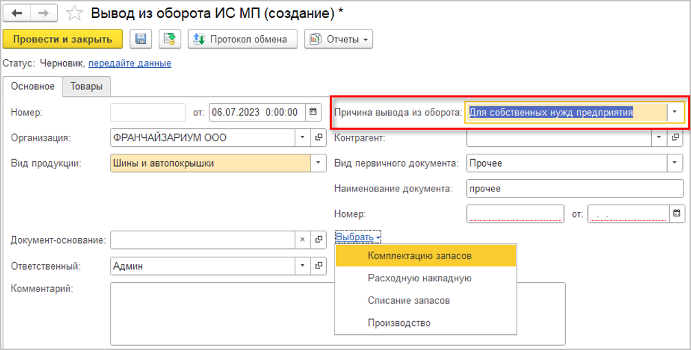 В зависимости от причины вывода доступен выбор «Комплектации запасов» в качестве документа-основания.