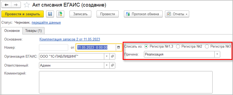 Для удобства передачи информации о списании алкогольной продукции в ЕГАИС поддержали формирование документа "Акт списания ЕГАИС" на основании документа "Комплектации запасов". Теперь при проведении документа "Комплектация запасов" с операцией "Сборка" и алкогольной продукцией в табличной части "Товары" автоматически формируется гиперссылка для создания "Акта списания ЕГАИС", а так же статус с подсказкой "К оформлению" в панели обмена с ЕГАИС.