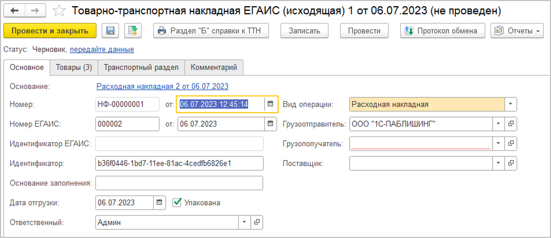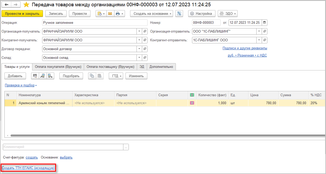 Для удобства передачи в систему ЕГАИС информации о передаче алкогольной продукции между собственными юридическими лицами поддержали формирование документа "ТТН Исходящая ЕГАИС" на основании "Передачи товаров между организациями". Теперь при проведении документа "Передача товаров между организациями" с алкогольной продукцией автоматически формируется гиперссылка для создания исходящей ТТН ЕГАИС, а так же статус с подсказкой "Оформить ТТН в панели обмена с ЕГАИС".
