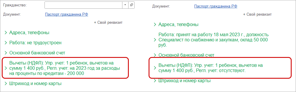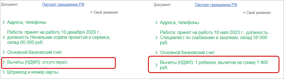 Теперь суммы назначенных вычетов можно просмотреть прямо из карточки сотрудника.