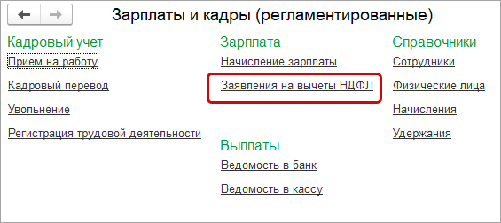 В разделе: Персонал – Регламентированный учет – Зарплата и кадры (регламентированные) добавлена возможность открыть список документов, управляющих вычетами сотрудников – «Заявления на вычеты НДФЛ».