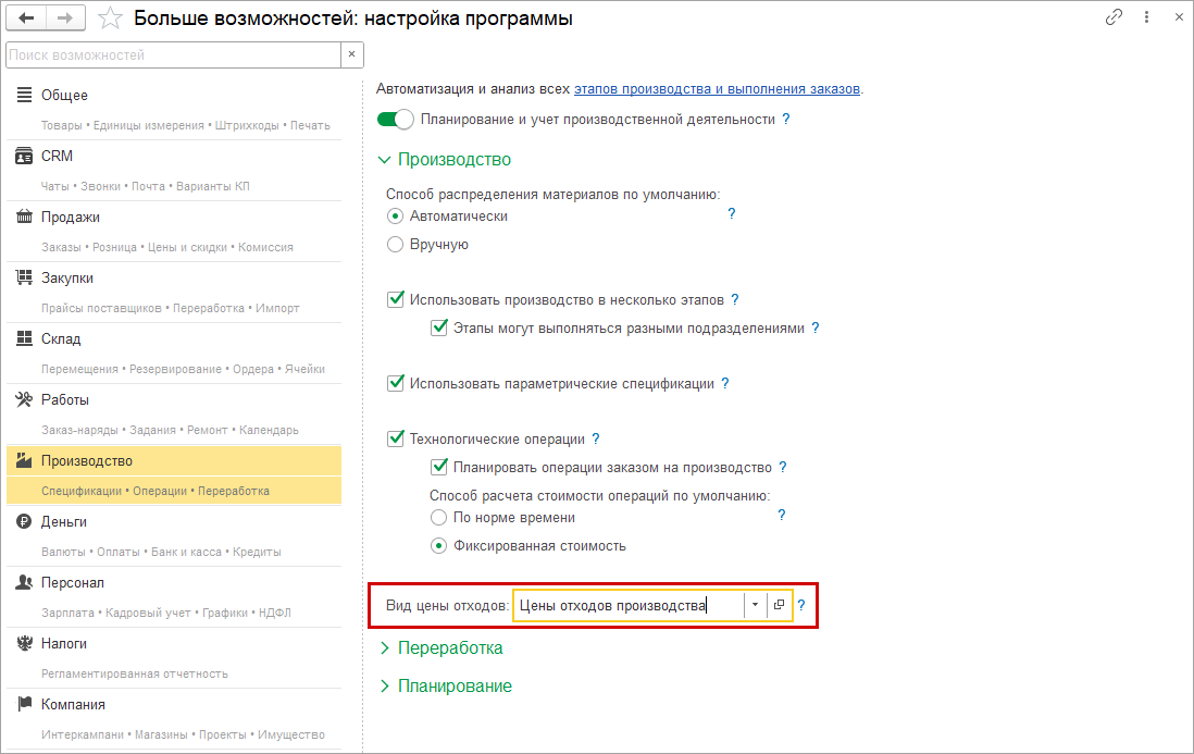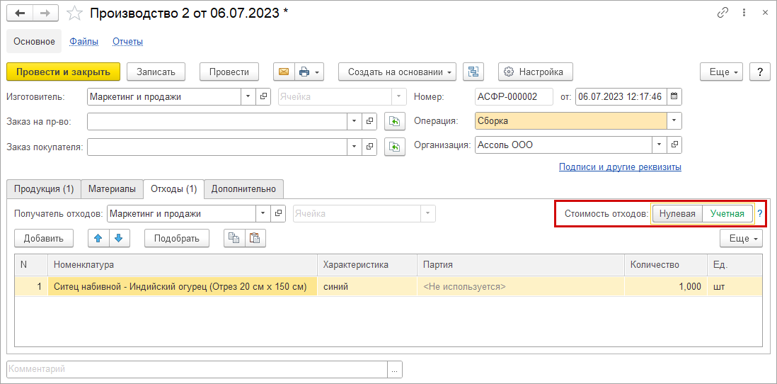 Если в документе "Производство" установлен вариант учета отходов "Учетный", то стоимость возвратных отходов переносится в 1С:БП.