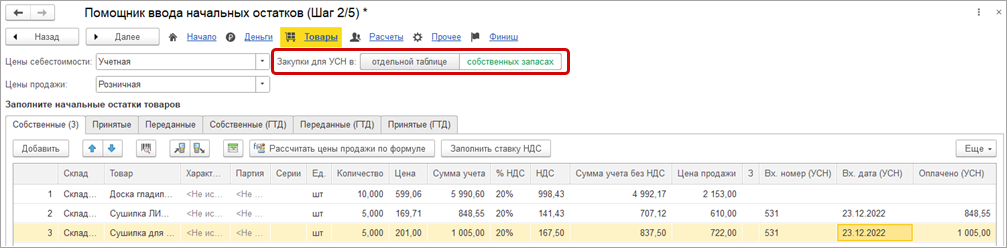 Ввод остатков закупок товаров для УСН теперь выполняется вместе с вводом остатков по складам. Это позволит оперативнее вводить данные об остатках в одном окне. Теперь с помощником на втором шаге ввода остатков "Товары" можно переключить способ ввода – вместе с собственными запасами или отдельной таблице.