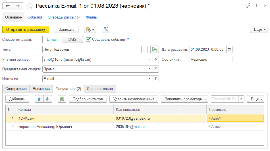 Подбираем получателей промокодов на одноименной закладке. Напротив каждого получателя появится колонка "Промокод" со значением <Авто>.