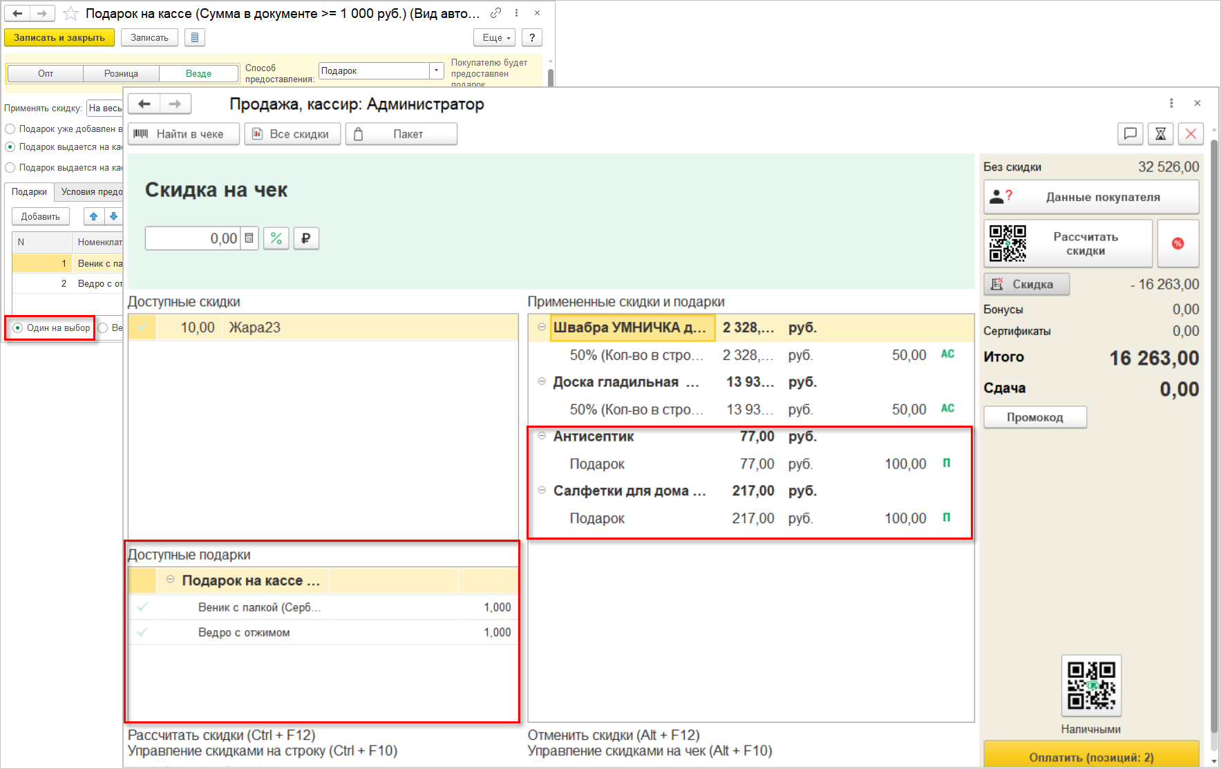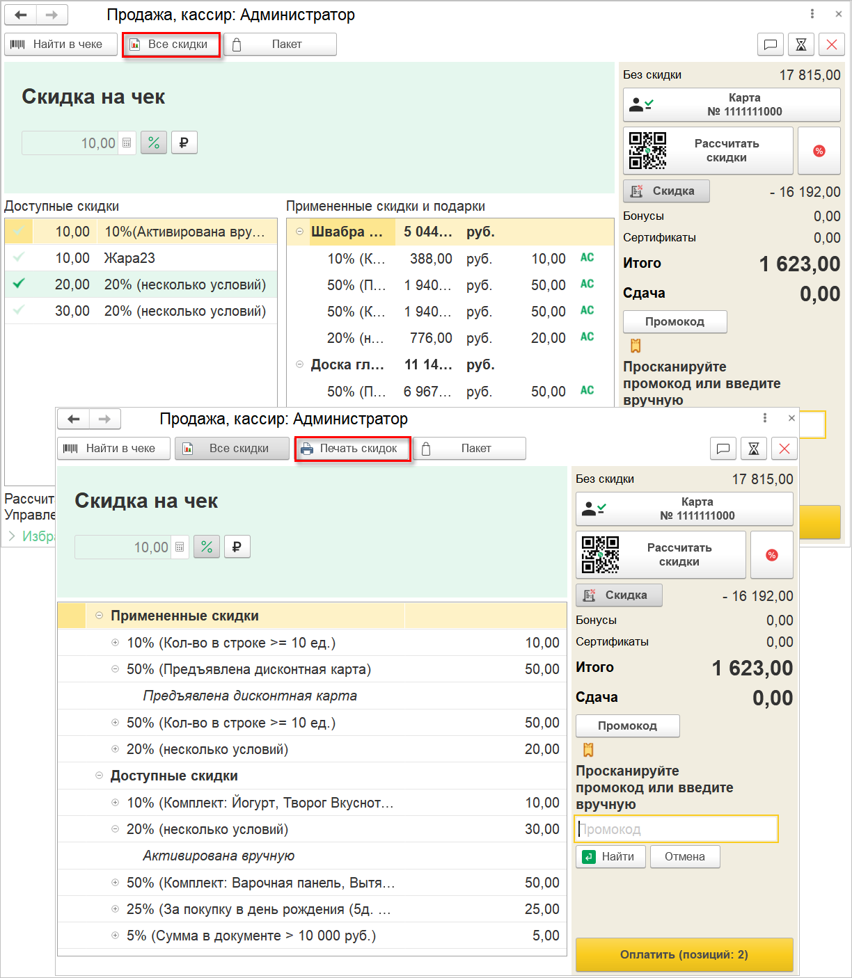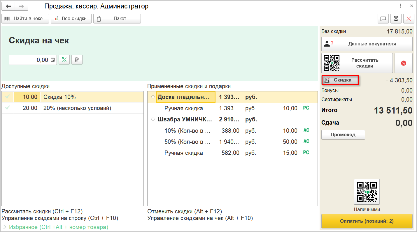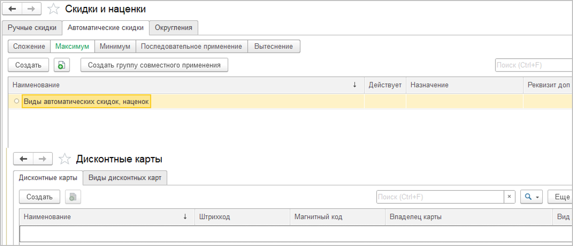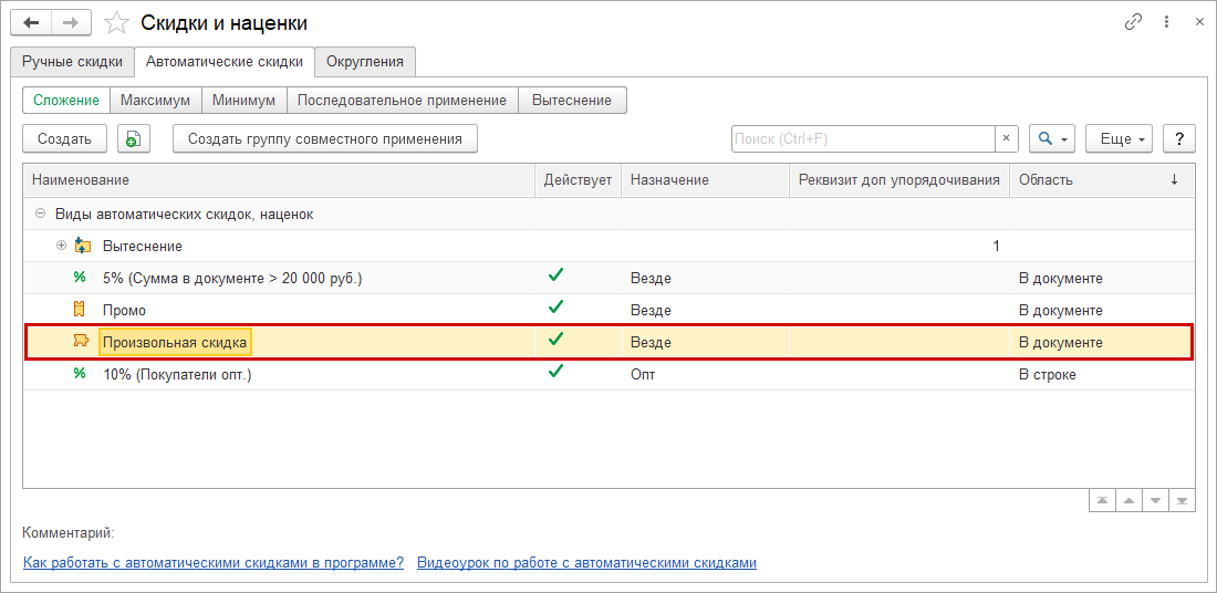 Для сложных условий применения автоматических скидок поддержана возможность использования и редактирования схемы компоновки данных (СКД) вплоть до запроса.
