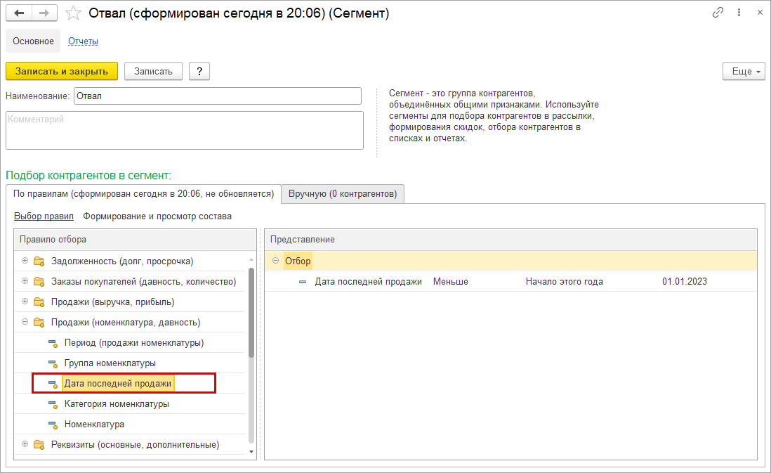 Добавьте в сегмент показатель "Дата последней продажи" перетянув его из группы “Продажи (номенклатура, давность)”, укажите дату и способ сравнения. Например, в сегмент на