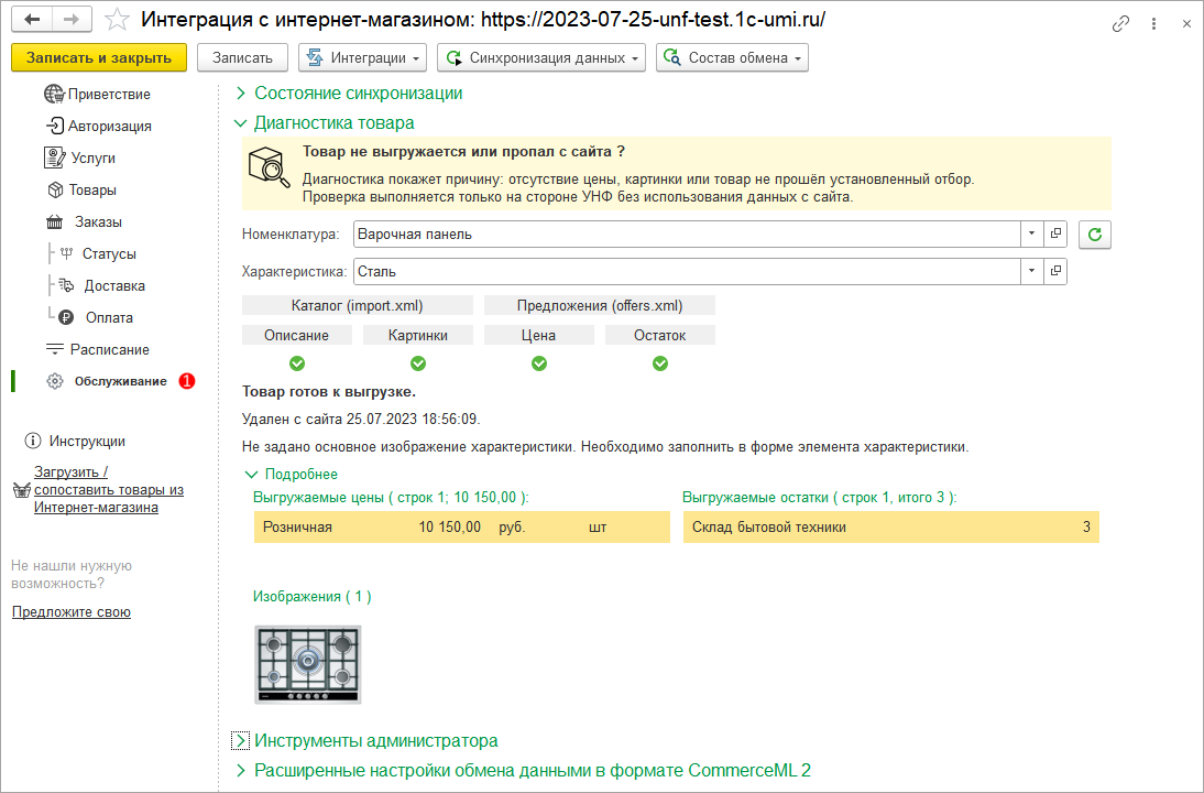 Диагностика покажет причины отсутствия товара, незаполненной цены или картинки. Сообщит, если товар не прошел установленный отбор. По кнопке "Диагностика товара" откроется таблица с текущим состоянием товаров и доступными действиями: добавлен, изменен, удален.