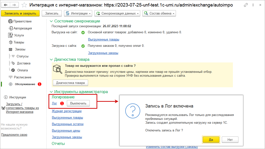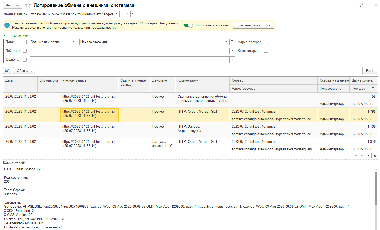 Также здесь можно включить запись в лог подробных технических данных об обмене. В логе фиксируются все технические данные, включая содержимое http-запросов, для дальнейшего расследования проблемных ситуаций.