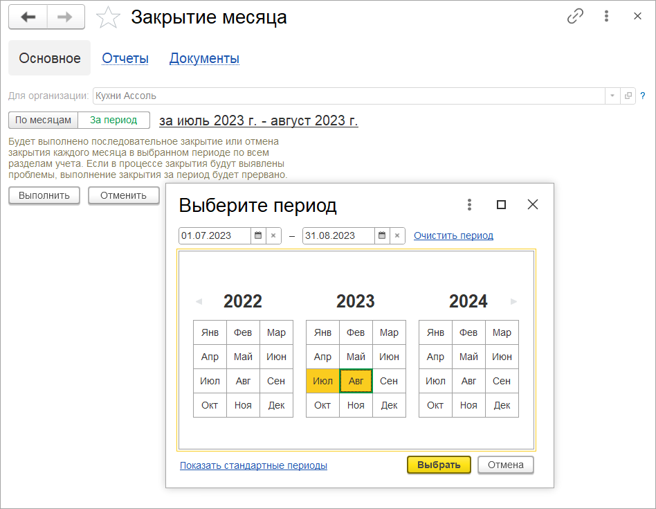 Сделали возможным выполнить закрытие и отмену закрытия месяцев за выбранный период. Теперь, если были внесены изменения в документы прошлых периодов, не нужно вручную закрывать каждый месяц. Можно выбрать период, за который необходимо закрыть или отменить закрытие месяцев, после чего эти операции будут последовательно выполнены по всем разделам учета.