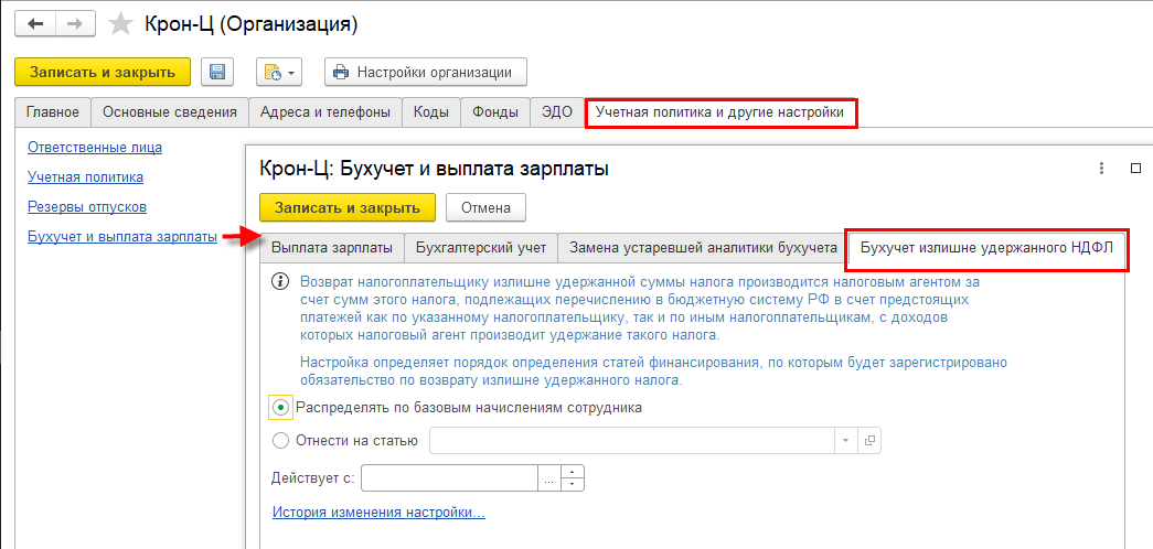 Добавлена возможность настройки бухучета излишне удержанного НДФЛ.