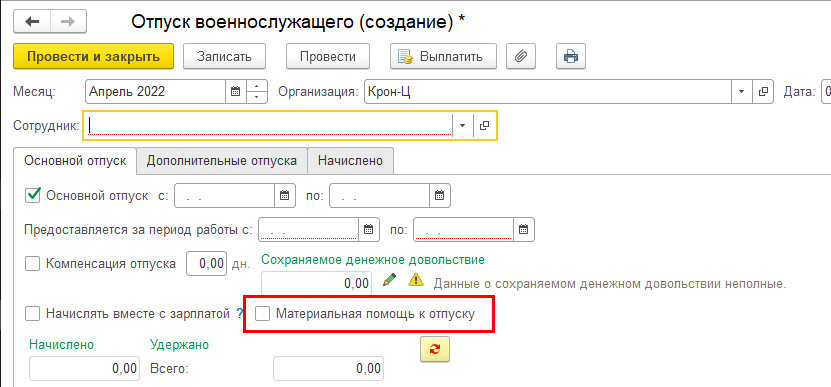 Добавлена возможность начислять материальную помощь в документе "Отпуск военнослужащего".