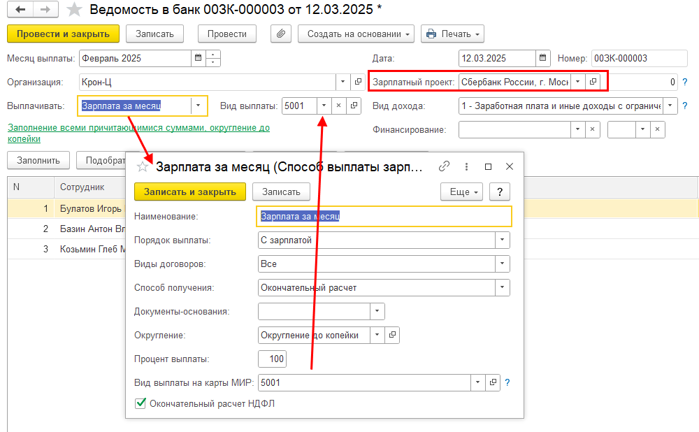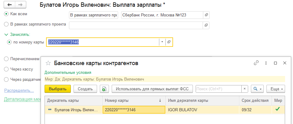 При выборе этого проекта у сотрудников можно выбрать только способ зачисления по номеру карты, и в списке карт сотрудника показываются только карты Мир.
