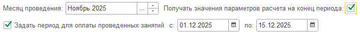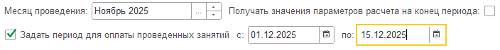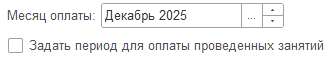 А можно по новому - задать произвольный период для оплаты проведенных занятий, установив соответствующий флаг. При этом поле выбора месяца становится бесполезным и скрывается, но появляются поля ввода границ периода:
