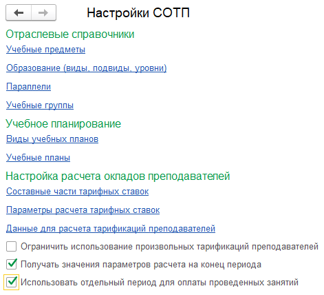 При заполнении документов "Тарификация преподавателей" и "Оплата проведенных учебных занятий", когда выбран способ ввода «По учебному плану», появилась возможность запретить добавление составных частей тарифной ставки или оплаты фактически проведенных занятий вручную Это так называемый «гибридный» режим. Для этого в настройки СОТП предусмотрен флаг «Ограничить использование произвольных тарификаций преподавателей».