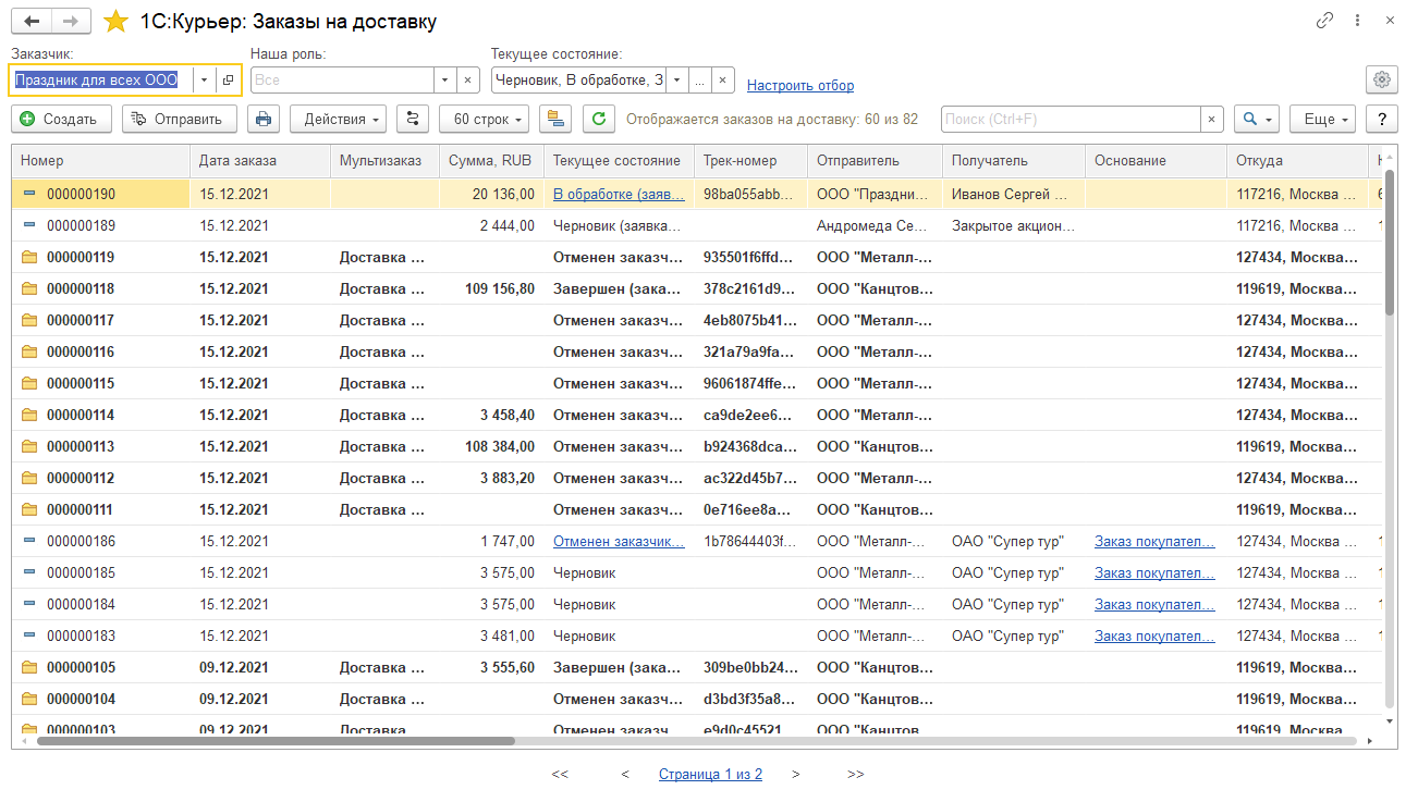 После успешной отправки перевозчику мультизаказов они отображаются в списке заказов для дальнейшего отслеживания. Пиктограмма для мультизаказов имеет вид папки.