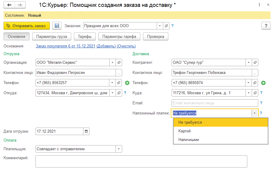Необходимость приема оплаты наложенным платежом по конкретному заказу на доставку указывается в форме заказа на закладке Основное. При этом сразу же указывается желаемая форма оплаты. Указанный вариант является предварительным и по согласованию перевозчика с покупателем при выдаче заказа может быть выбрана другая форма оплаты.