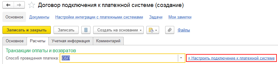 Для настройки работы с СБП создается договор подключения к платежному сервису в разделе Казначейство – Эквайринг - Договоры подключения к платежным системам. Этот справочник используется для настройки расчетов как по эквайрингу, так и для расчетов по СБП. Конкретный способ определяется реквизитом Способ проведения платежа на закладке Расчеты. В договоре указываются платежные реквизиты для взаимодействия с банком (банковская выписка). По договору со способом проведения платежа СБП настраивается подключение к СБП. Настроить подключение можно в разделе НСИ и Администрирование - Администрирование - Интернет-поддержка и сервисы - Система быстрых платежей или из формы договора по гиперссылке + Настройка подключения к платежной системе. Настройка доступна пользователю с полными правами или пользователь, в профиль доступа которого включена роль Настройка подключения к СБП.