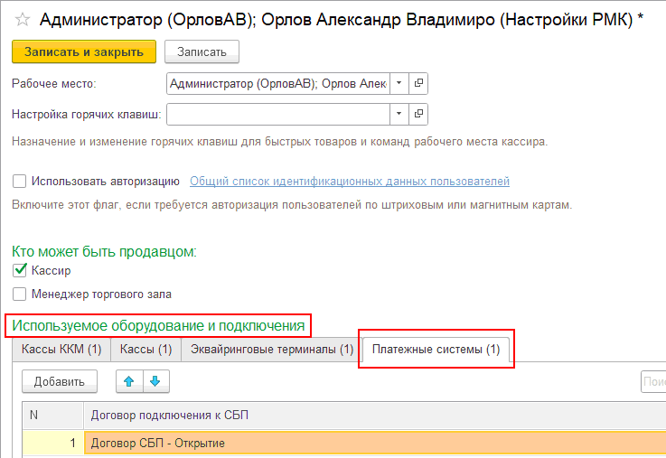 Для каждого пользователя (рабочего места кассира), который должен иметь возможность принимать оплату через СБП, в настройки РМК на закладке Платежные системы указываются договоры подключения к платежным сервисам. Если указан хотя бы один договор, то у пользователя появится возможность принимать оплату через СБП. Договор связан с настройками подключения к платежному сервису конкретного банка, как результат, указанные в настройках РМК договора определяют перечень банков (настроек подключения), с которыми будет обмен данными по оплате/возврату через СБП.