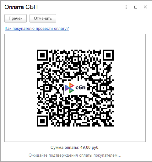 После получения QR-кода для оплаты его нужно предоставить покупателю. Если подключен дисплей покупателя, QR-код оплаты выводится на дисплее покупателя, иначе QR-код оплаты автоматически выводится на кассовой ленте. В случае необходимости в любой момент пользователь может вывести QR-код оплаты на кассовую ленту, нажав кнопку Пречек.