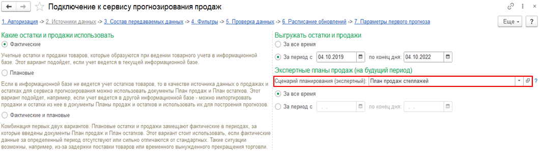 В некоторых случаях заранее известен объем будущих продаж. Поддержана возможность сообщить сервису прогнозирования о таких планах. Для этого на закладке Источники данных помощника подключения предназначено поле выбора Сценарий планирования (экспертный) и поля отбора по периоду.