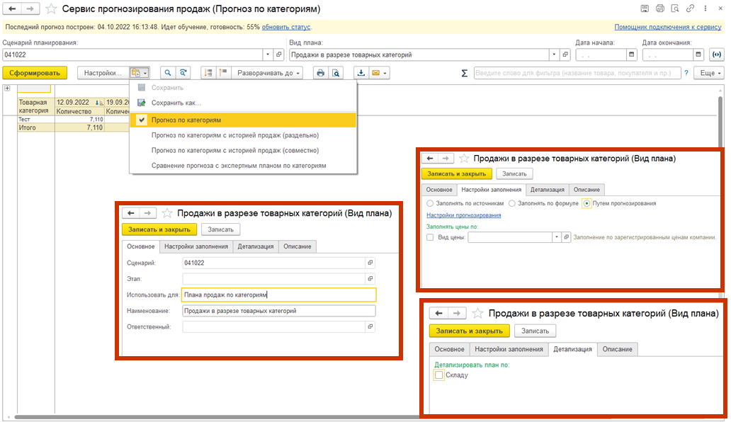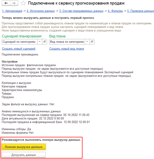 Будут выгружены все документы План продаж по номенклатуре за указанный период, по выбранному Сценарию, в случае если соответствующая коллекция отмечена к выгрузке. Сервис прогнозирования учитывать сообщенную ему информацию при построении собственных прогнозов.
