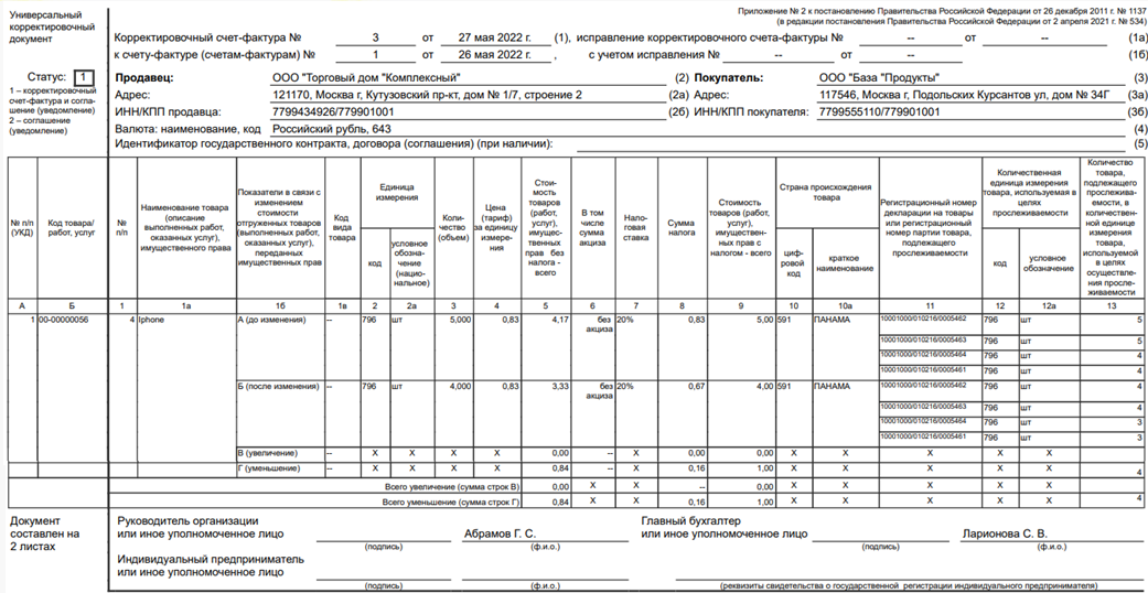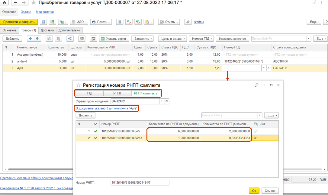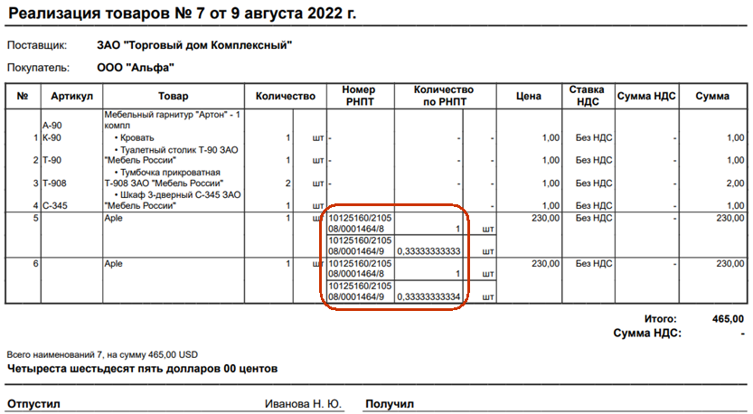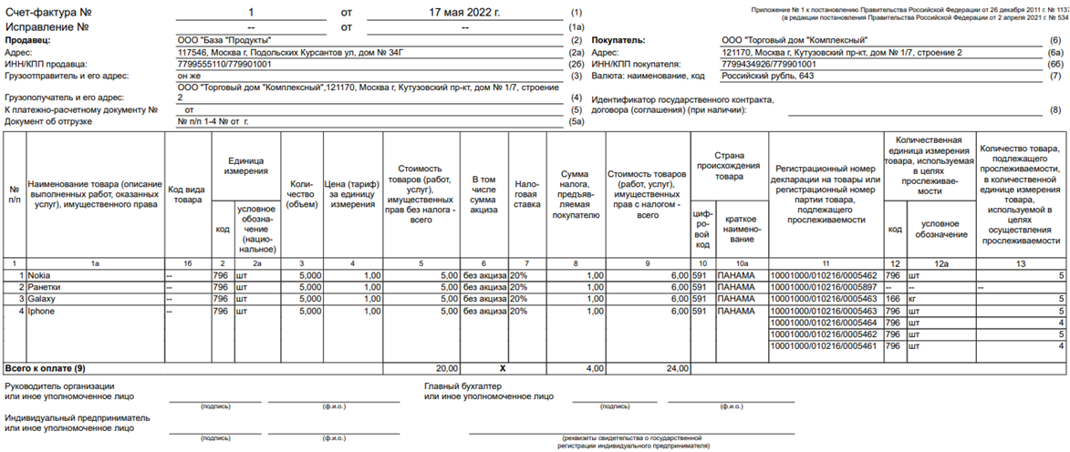 При последующей реализации набора (комплекта), поскольку в состав набора (комплекта) входит товар, подлежащий прослеживаемости, счет-фактура или универсальный передаточный документ подлежит формированию в электронной форме. При этом в новых графах счета-фактуры, содержащих реквизиты прослеживаемости (регистрационный номер партии товара, подлежащего прослеживаемости (далее – РНПТ), количественная единица измерения товара, используемая в целях осуществления прослеживаемости (код и условное обозначение), количество товара, подлежащего прослеживаемости, в количественной единице измерения товара, используемой в целях осуществления прослеживаемости), подлежат отражению реквизиты прослеживаемости по каждому товару, подлежащему прослеживаемости, включенному в набор (комплект), в подстроках к строке с набором (комплектом).