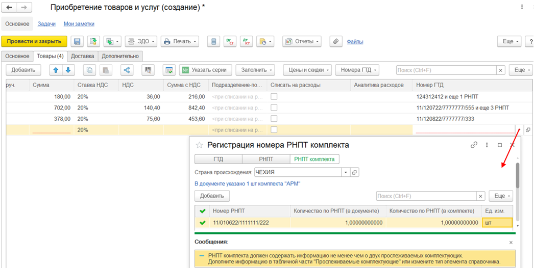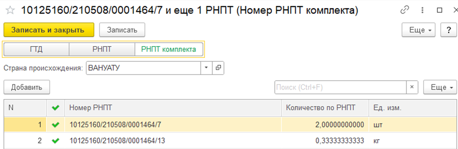 Подробная информация о составе номеров РНПТ комплекта хранится в табличной части справочника номера ГТД.