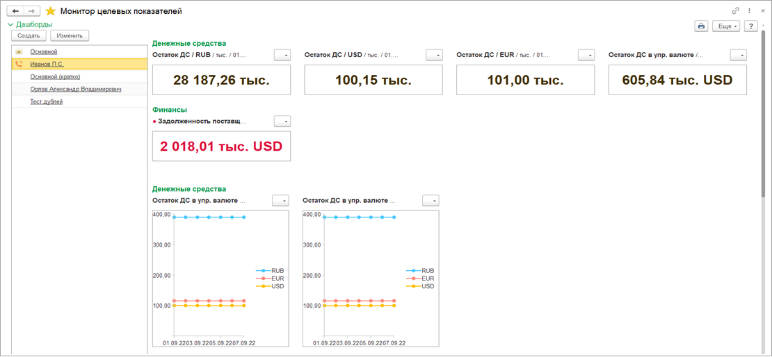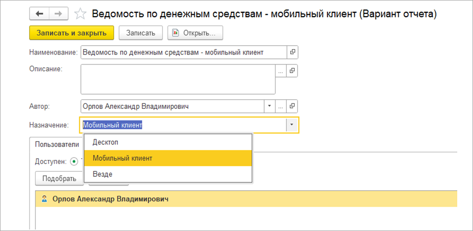 Данный функционал реализован за счет сохранения ранее сформированных отчетов в табличный документ в формате mxl. Для этих целей добавлены соответствующие команды в форму отчета. Отчеты сохраняются для каждого пользователя в разрезе варианта отчета дашборда МЦП.
