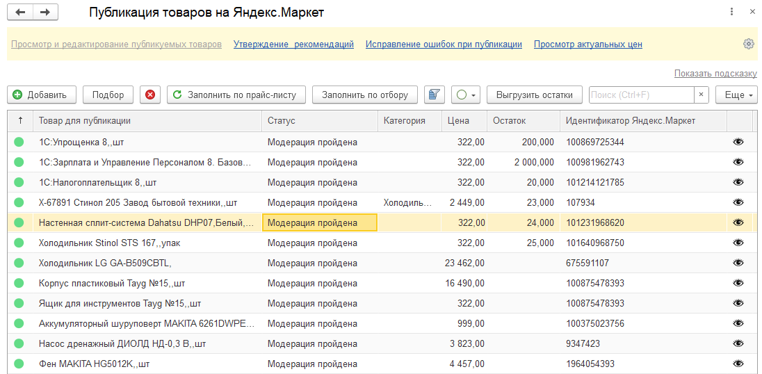 Данные об общих текущих остатках товаров по данным сервиса выводятся в форме Публикации товаров на Яндекс.Маркет в графе Остаток. В форме списка предусмотрена кнопка Выгрузить остатки для немедленной выгрузка остатков по инициативе пользователя.