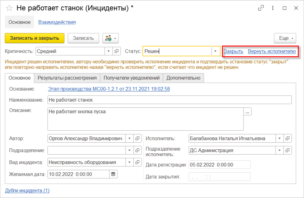 После изменения статуса автору инцидента направляется уведомление через систему взаимодействия. Автор может подтвердить решение инцидент, переводя его в статус Закрыт, или вернуть инцидент исполнителю как нерешенный, в статусе Зарегистрирован.