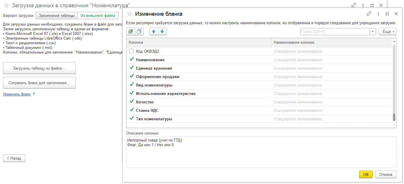 Необходимый состав реквизитов справочника Номенклатура не зависит от установленных функциональных опций. При загрузке элементов справочника установлен минимально необходимый набор обязательных реквизитов. Остальные реквизиты не обязательны для заполнения.