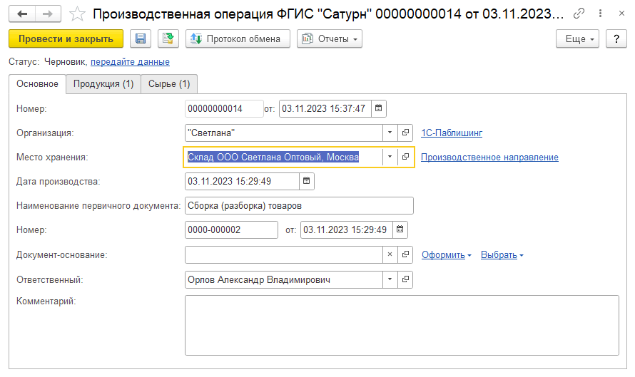 Отражения изготовления ПАТ с использованием документов Сборка(разборка) товаров для целей ФГИС Сатурн производится документом Производственная операция ФГИС "Сатурн". Создать документ можно из по ссылке Создать производственную операцию ФГИС "Сатурн" из документа Сборка(разборка) товаров, а также из рабочего места Обмен с ФГИС "Сатурн" по ссылке Создать в строке Производственные операция ФГИС "Сатурн" или непосредственно из списка Производственные операция ФГИС "Сатурн" на закладке К оформлению. В созданном документе автоматически заполняется организация по классификатору ФГИС "Сатурн" и адрес места хранения по данным сопоставления классификаторов и (или) ИНН и КПП.