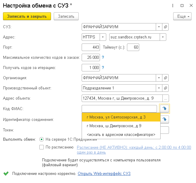 Реализована возможность указания кода ФИАС в настройках обмена с СУЗ для дальнейшего использования при передаче данных в ГИС МТ.