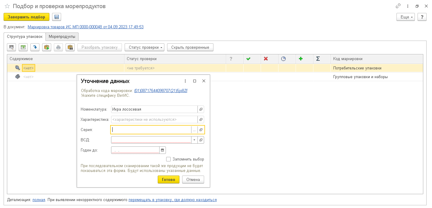 Документ Уточнение сведений о кодах маркировки ИС МП с видом операции Корректировка сведений о ВСД и сроке годности применяется для товарной групп Молоко и молочная продукция. При выполнении операции требуется сканирование кода маркировки. При сканировании кодов запрашивается уточнение данных.