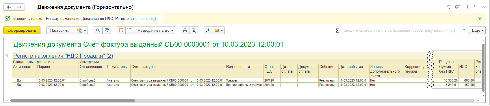 При проведении документ Счет-фактура выданный, выставленный на основании реализации с налогообложением Облагается НДС с межценовой разницы, формирует запись в регистр «НДС Продажи». В документах реализации с налогообложением Облагается НДС с межценовой разницы указанные движения не формируются.