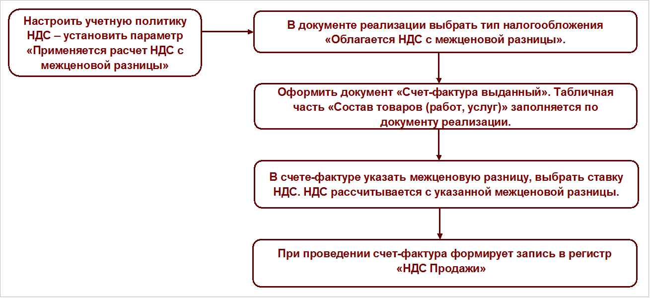 Последовательность действий по настройке системы и отражению операций для начисления НДС с межценовой разницы приведена на схеме.