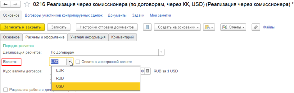 В договоре с клиентом с целью Реализация через комиссионера можно выбрать валюту взаиморасчетов, отличную от валюты взаиморасчетов, указанной в договоре с комиссионером с целью Передача на комиссию. Валюта расчетов в договоре с клиентом может отличаться от валюты расчетов в договоре с комиссионером.
