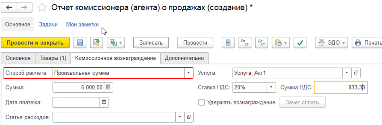 Ввод произвольной суммы вознаграждения за комиссионные услуги как на стороне комитента, так и на стороне комиссионера доступен в документах: