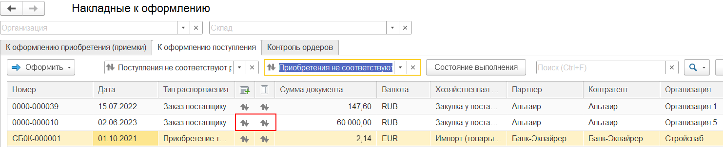 показывает, что поступление не соответствует распоряжению и/или приобретение не соответствует поступлению.