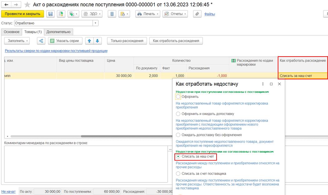 В сценарии недопоставки документ Списание расхождений между поступлением и приобретением также закрывает расхождения в «Товарах организаций» по собственным товарам по номерам ГТД и по Количеству по РНПТ.