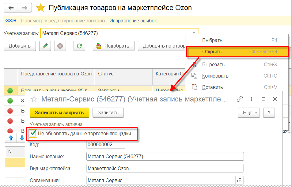 Для блокировки отправки неподготовленной информации по остаткам и ценам загружаемых карточек товаров необходимо отключить выгрузку данных на торговую площадку. Для отключения необходимо установить флаг Не обновлять данные торговой площадки в форме настроек подключения НСИ и администрирование – Настройки интеграции – Интеграция с маркетплейсами – Ozon – Настройки подключения. Флаг также можно установить из формы учетной записи маркетплейса, которую можно открыть из контекстного меню в поле Учетная запись формы Публикация товаров на маркетплейсе Ozon.